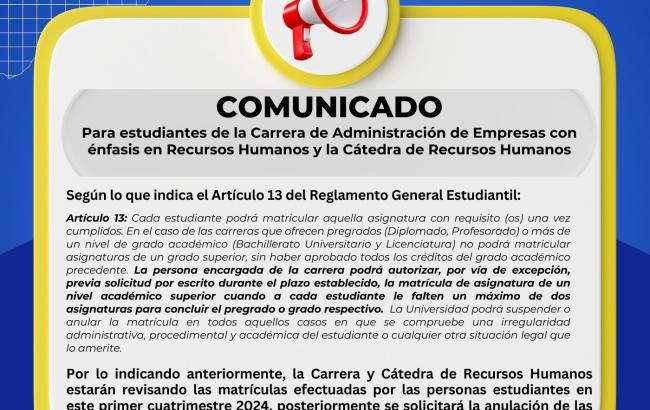 La carrera de Administración de Empresas con énfasis en Recursos Humanos tiene como objeto de estudio la gestión de las personas contratadas y sus relaciones dentro de la organización. Es decir, a partir de los conocimientos básicos en administración general y del dominio del área de recursos humanos, se brinda apoyo a las autoridades de la organización para que tomen decisiones asertivas, se favorezca el crecimiento personal y profesional de las personas contratadas y se facilite el equilibrio de los intereses de ambas partes, de manera que estas relaciones se den en condiciones armoniosas y efectivas, dentro de la normativa nacional e internacional.